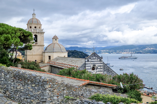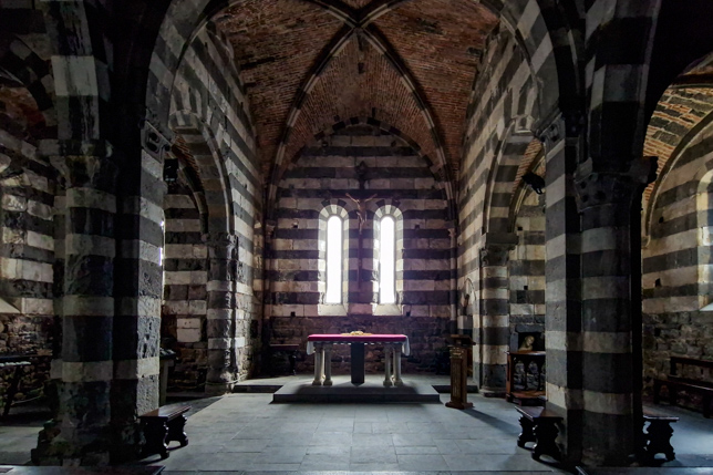 Im Stil der Genueser Gotik erstrahlt die Kirche innen wie außen in elegantem schwarzem und weißem Marmor. Von einer kleinen Loggia aus genießen Besucher einen spektakulären Blick entlang der zerklüfteten Küste der Cinque Terre.