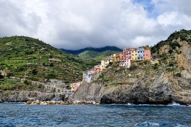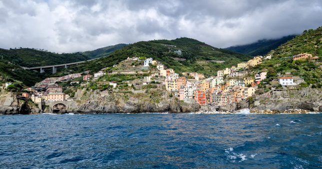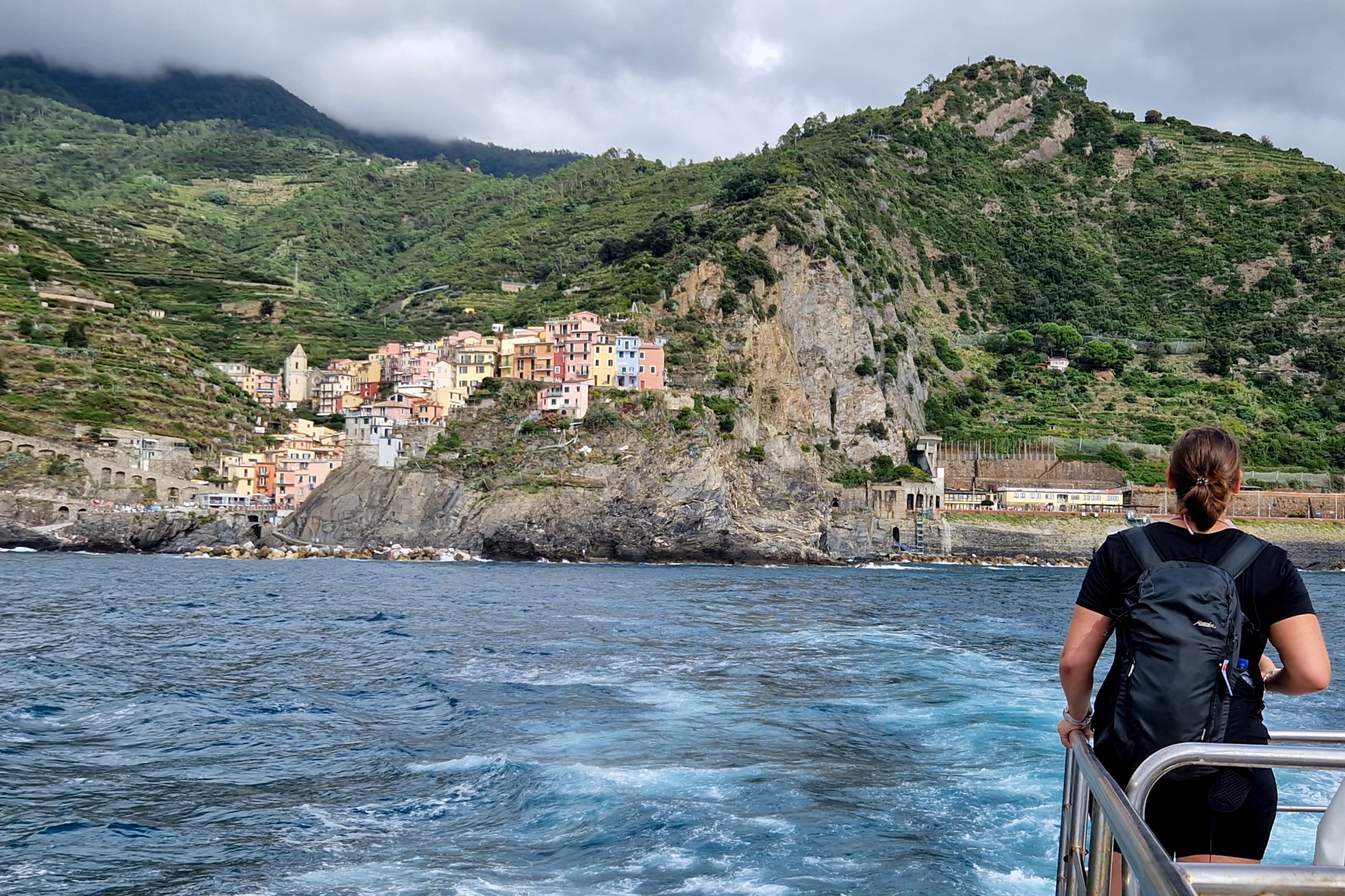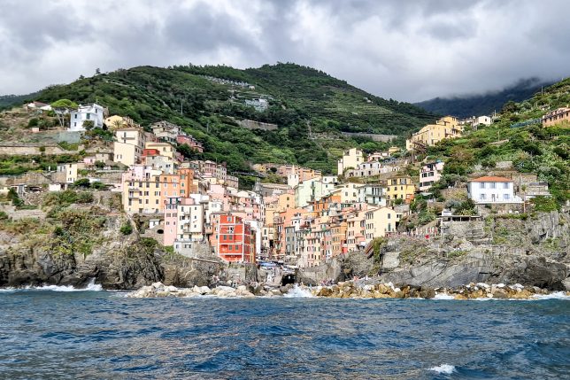 Der böige Wind, der die Wolken nur träge vom Himmel scheuchte, sorgte für ordentlichen Wellengang. Das Boot schaukelte durch die Wellen, doch die Sorge, seekrank zu werden und die Fahrt auf der Toilette zu verbringen, erwies sich zum Glück als unbegründet. Nach etwa 30 Minuten kam das erste der fünf berühmten Dörfer der Cinque Terre ins Blickfeld: Riomaggiore.