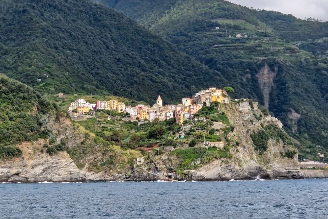 Das dritte Dorf Corniglia ist das einzige, das nicht direkt am Meer, sondern auf einem luftigen Bergrücken thront und daher nicht mit dem Boot angefahren wurde. Am Hafen von nächsten Halt Vernazza hatten ein- und aussteigende Fahrgäste mit dem hohen Wellengang zu kämpfen und wurden auf dem schwankenden Steg zwischen Boot und Pier ordentlich durchgeschüttelt.