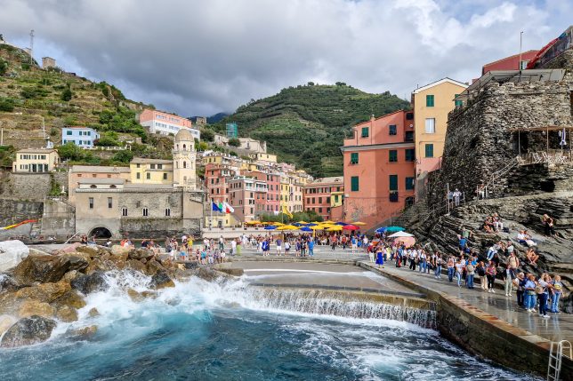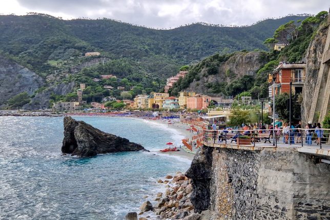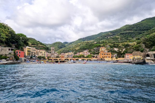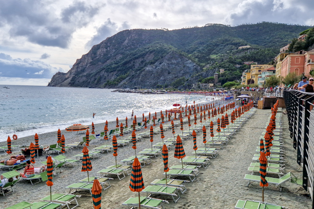 Vom ersten Dorf Riomaggiore, dessen Wohnhäuser sich wie in den meisten anderen Dörfern entlang eines kleinen Flussbettes drängen, war es nur ein Katzensprung bis nach Manarola. Das Dorf versteckte sich, von Süden kommend, schüchtern hinter einem markanten Felsvorsprung. Auf der gegenüberliegenden Talseite entdeckten wir mit perfektem Blick auf die bunt gestapelten Häuschen die große Aussichtsterrasse des Lokals Nessun Dorma, zu der unzählige Touristen wie Ameisen zu Fuß unterwegs waren. Alex las später zu Hause, dass man sich per App in einer virtuellen Warteschlange für einen Platz auf der Terrasse anstellen muss – nur so scheint man dem Besucherandrang Herr zu werden.