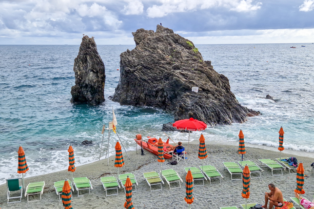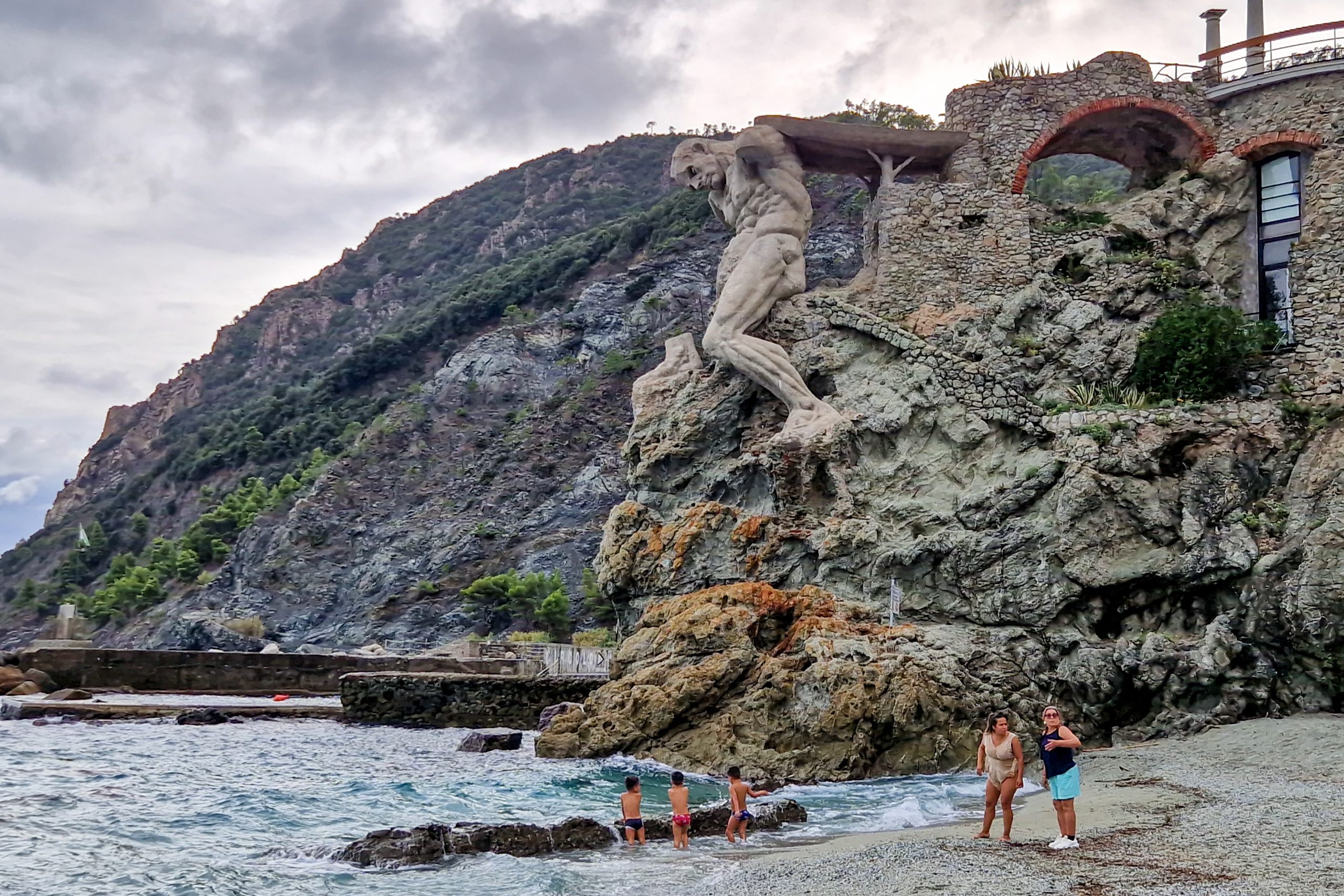 Bei unserer Ankunft war es erst kurz nach halb fünf – für’s Abendessen noch etwas früh, daher spazierten wir gemütlich durch den Tunnel hinüber nach Fegina mit seinem langen Sandstrand, einer Rarität in den ansonsten felsigen Cinque Terre. Ganz am Ende des Ortes steht die ordentlich ramponierte Betonfigur des “Il Gigante”. Dem dargestellten Neptun fehlt mittlerweile sein charakteristischer Dreizack, einen Arm hat er auch schon verloren, und die Muschelschale, die er einst stolz auf seinen Schultern trug, wurde durch eine schlichte Plattform ersetzt – ein melancholisches Denkmal vergangener Zeiten.