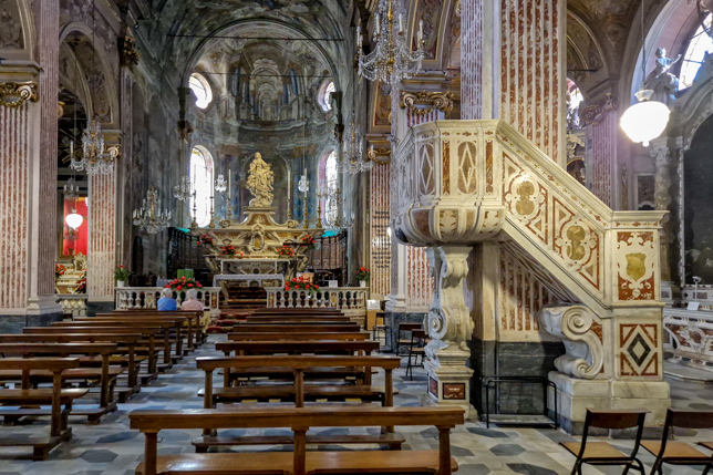 Hier reihen sich Bars, Cafés, kleine Geschäfte und Restaurants aneinander und schaffen eine lebendige Atmosphäre. Am Ende öffnet sich die enge Gasse zur weiten Piazza Matteotti mit dem imposanten klassizistischen Portal der Basilika Santa Maria di Nazareth. Portal und Innenraum bilden einen absoluten Stilbruch: Während außen symmetrische Formen und klare Linien in Anlehnung an griechische und römische Tempel dominieren, überwältigt im Inneren die überbordende Verspieltheit des Barock.