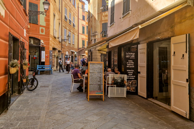 Wir schlenderten zurück in die angenehm kühle und schattige Altstadtgasse, eigentlich auf der Suche nach einer Erfrischung, doch die verlockende Speisekarte der Bottega del Caffè verführte uns zu einer kleinen Stärkung. Wir ließen uns einen Toast und ein traditionelles Focaccia schmecken – jenes ursprünglich aus Genua stammende Brot, das man hier an jeder Straßenecke in verlockender Vielfalt findet. Das goldbraune Hefegebäck ist außen herrlich knusprig und innen wunderbar saftig. Das Geheimnis? Großzügige Mengen ligurischen Olivenöls, das dem Focaccia seinen Geschmack verleiht – und demjenigen, der es aus der Hand isst, fettige Finger.