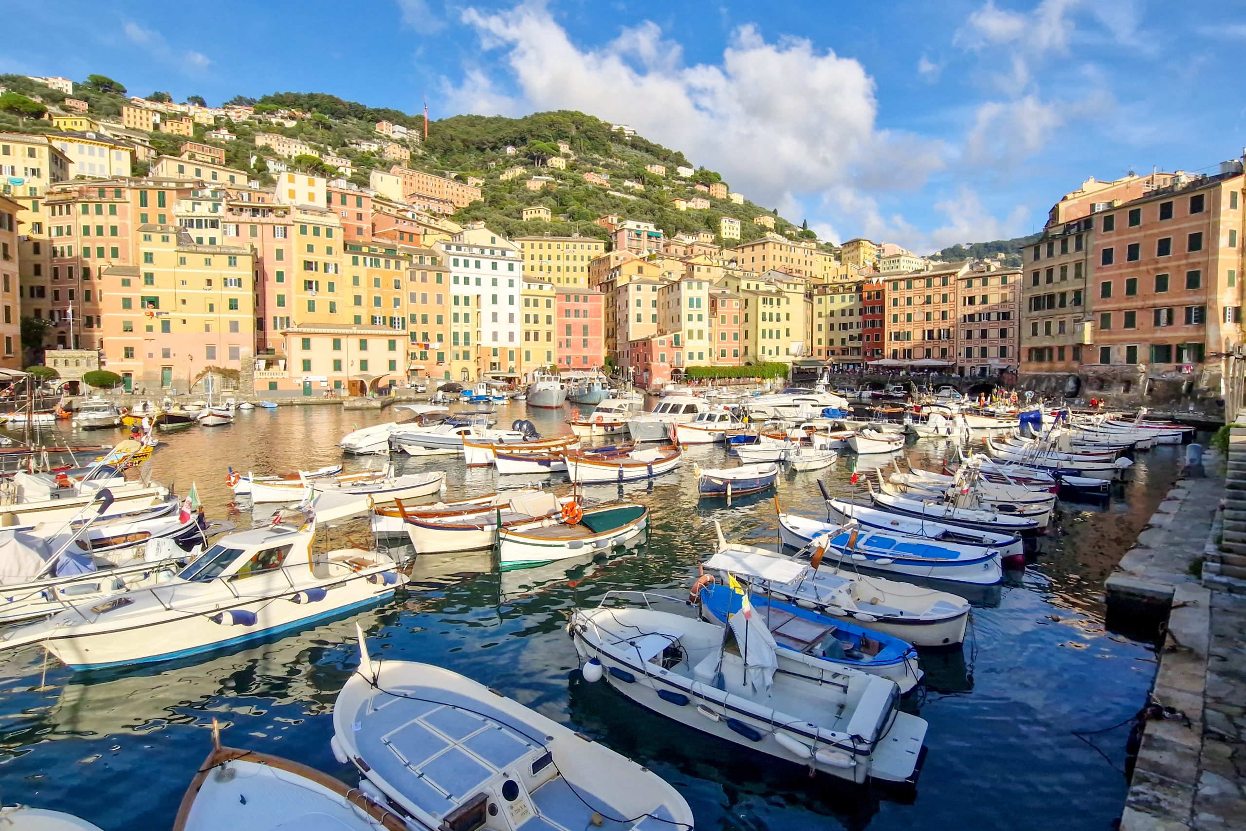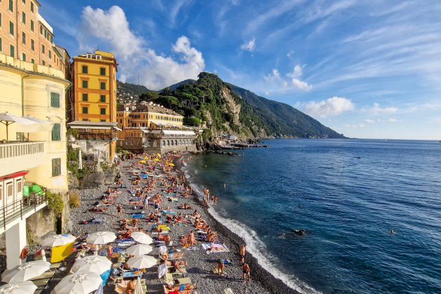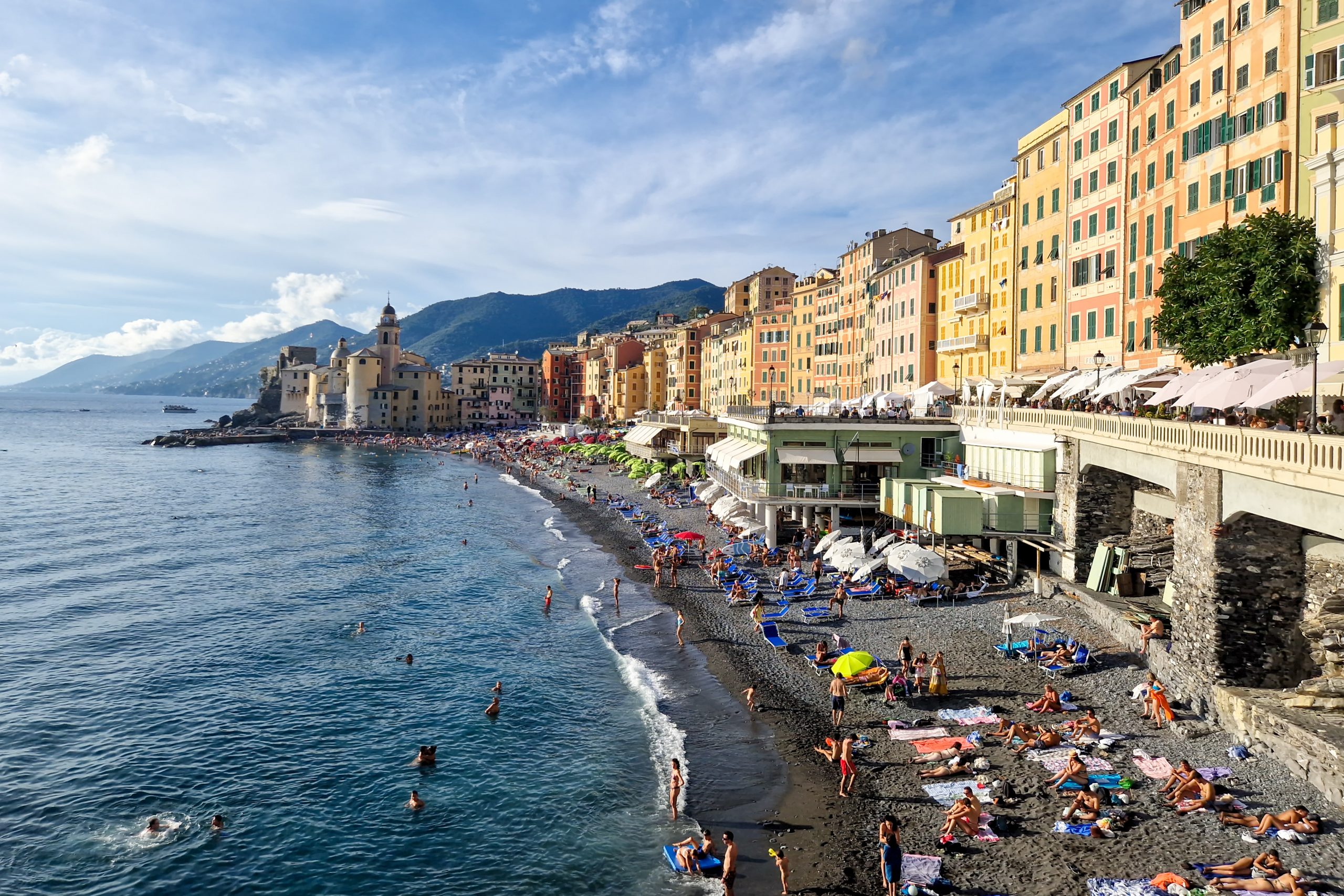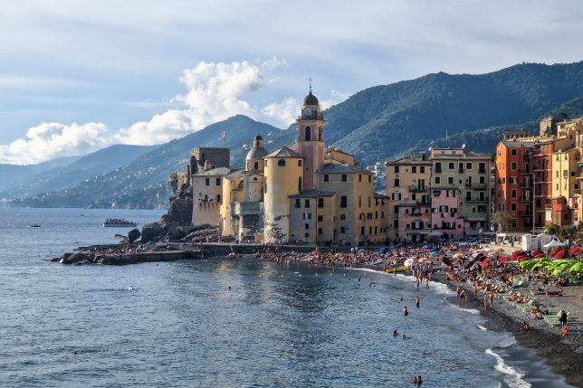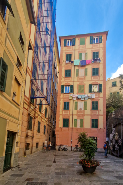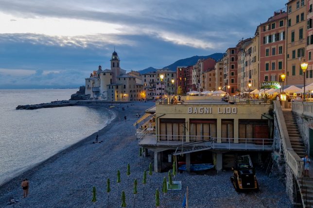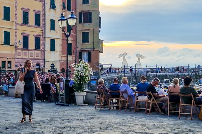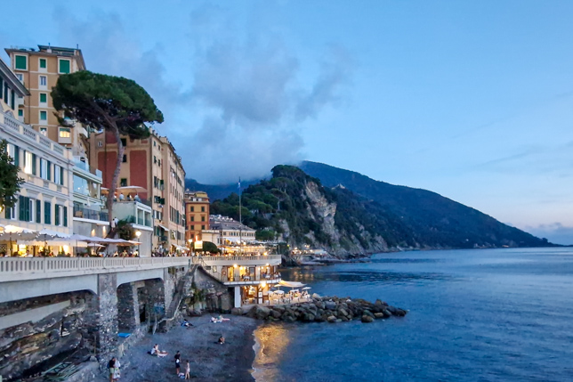 Bis zum späten Nachmittag genossen wir unter dem Sonnenschirm diese letzten Stunden des Sommerwetters, bevor wir zu einem Ausflug nach Camogli aufbrachen: Die kleine Gemeinde schmiegt sich in bunten Farben an das westliche, zerklüftete Ufer der Portofino-Halbinsel. Die beengten Platzverhältnisse am schmalen Küstenstreifen zwangen die Erbauer der Häuser, sie in die Höhe wachsen zu lassen – das verleiht Camogli seine unverwechselbare Architektur und seinen Charme.