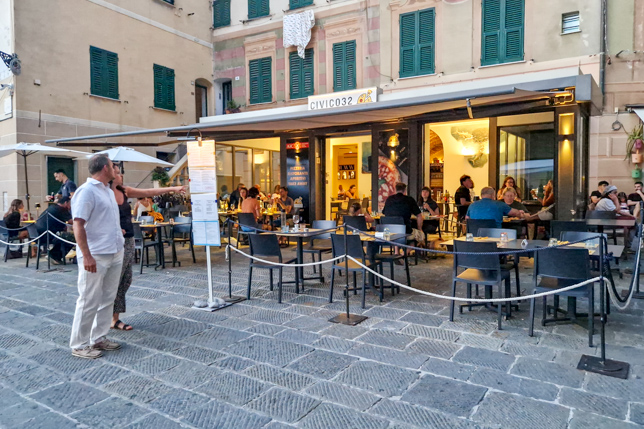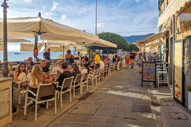 Wir schlenderten die sanft abfallende Uferpromenade hinab bis zum Ende der malerischen Bucht, wo sich an der kleinen Landzunge das mittelalterliche Castello Dragone und die Pfarrkirche Santa Maria Assunta den knappen Platz teilen.