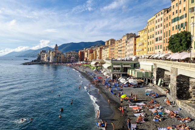 Durch einen schmalen Durchgang zwischen den Häusern hindurch eröffnete sich uns der Blick, der sofort verständlich machte, warum Camogli als eine der schönsten Küstenorte der gesamten ligurischen Riviera gilt. Hoch oben über dem Strand thronen Cafés und Restaurants auf der schmalen Promenade und warten geduldig auf ihre Besucher, während sich unten am Kieselstrand Handtuch an Handtuch reiht.
