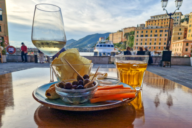 Bis zum Abendessen gönnten wir uns einen Aperitif in einem der charmanten Hafencafés und sogen die Atmosphäre in uns auf. Die Sea Bar Bistingo überraschte uns mit einem kleinen Teller voller kleiner Häppchen – unaufgefordert als Begleitung zu unseren Drinks serviert. Sofort begannen wir zu spekulieren, was uns diese kleinen Gaumenfreuden wohl kosten würden. Die große Überraschung folgte bei der Rechnung: Die Snacks waren inklusive. Die Getränkepreise waren für die schöne Lage absolut fair – die Kosten für das kleine Schälchen Oliven, die knackigen Karottenstücke und die Mini-Focaccia waren offensichtlich bereits mit einkalkuliert.
