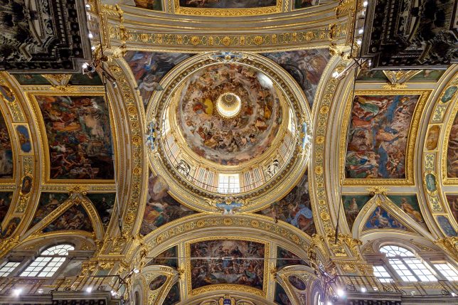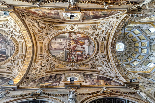 Wie so oft lohnt auch hier ein Blick nach oben auf den Freskenzyklus im Deckengewölbe „Triumph des Namens Jesu”, der zwischen 1672 und 1685 entstand und nahezu den gesamten Kirchenraum überspannt.