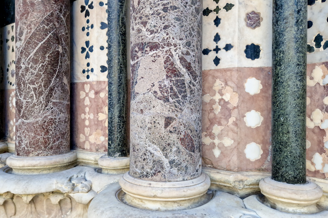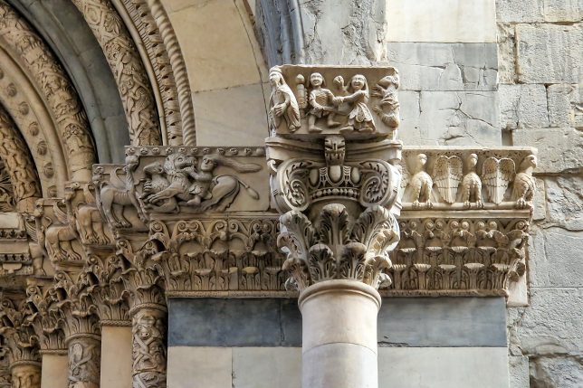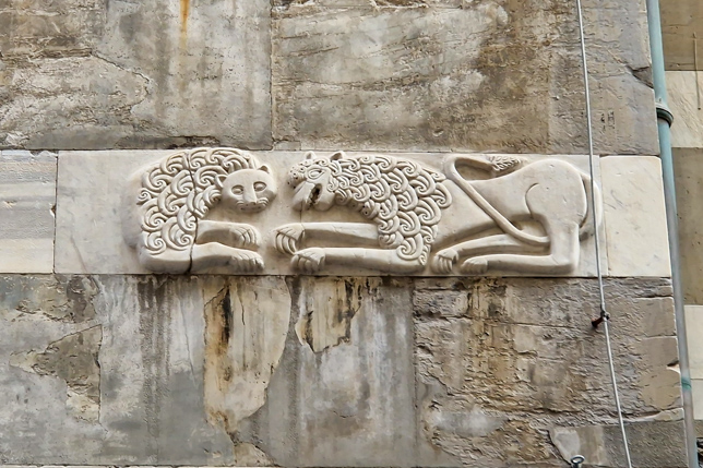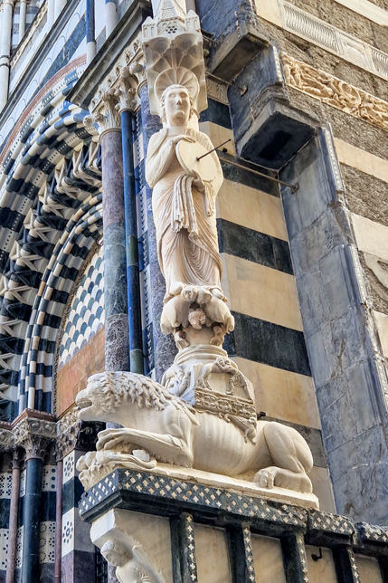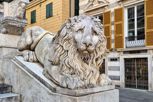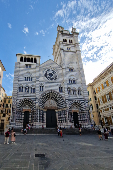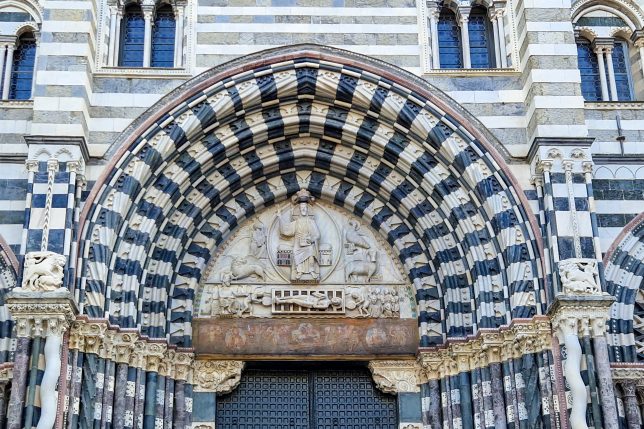 Unweit der Piazza San Matteo steht die wichtigste Kirche Genuas, die ebenfalls in schwarzem und weißem (und an den Säulen der Portale auch rot und grün) Marmor gehaltene Kathedrale San Lorenzo. An der imposanten Westfassade vom Anfang des 14. Jahrhunderts mit den drei Portalen lassen sich einige spannende Details entdecken – so zum Beispiel die beiden mächtigen Löwen, die rechts und links die Kirche bewachen. Auf der rechten Seite steht die Statue eines Messerschleifers, der den Evangelisten Johannes mit einer Sonnenuhr in der Hand darstellt.