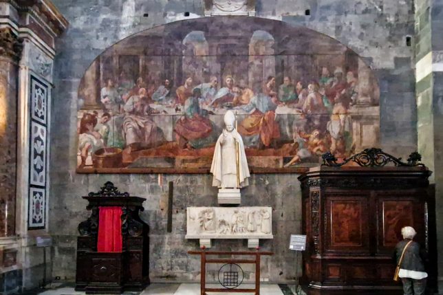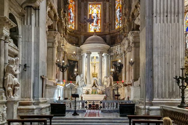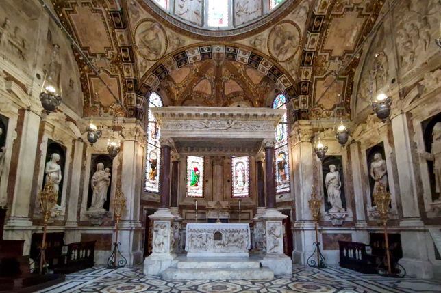 Im Innern ist die prunkvolle Kapelle im linken Seitenschiff beeindruckend, in der die Asche Johannes des Täufers aufbewahrt wird.