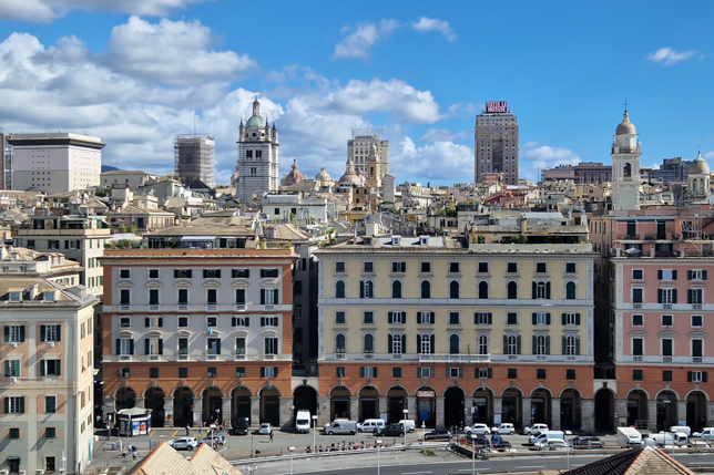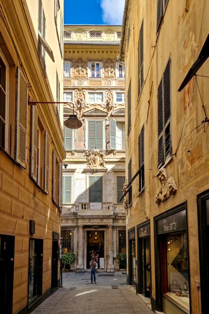 Weit mussten wir dafür nicht gehen: Linkerhand erblickten wir die Hauptfront des Palazzo Ducale, Amtssitz des Dogen, also des Staatsoberhaupts der Republik Genua. An der Fassade sind eine Reihe berühmter Häftlinge als Statuen in Eisenketten dargestellt. Heute ist das Gebäude Kulturzentrum und damit ein Ort für Ausstellungen, Konzerte und Messen.