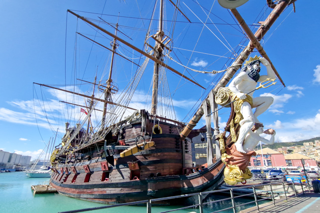 Wir hatten uns eine kurze Pause auf der Piazza de Ferrari verdient, wo wir unseren Rundgang gestartet hatten. Von dort aus liefen wir Richtung Alter Hafen, wo Yachten auf einen Ausflug ihrer Besitzer warten, Besucher das größte Meerwasseraquarium Europas bestaunen können oder einen Blick auf den originalgroßen Nachbau eines spanischen Segelschiffs werfen können, das als Requisit für Roman Polańskis Film Piraten diente.