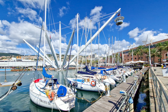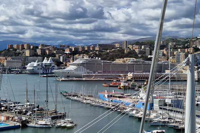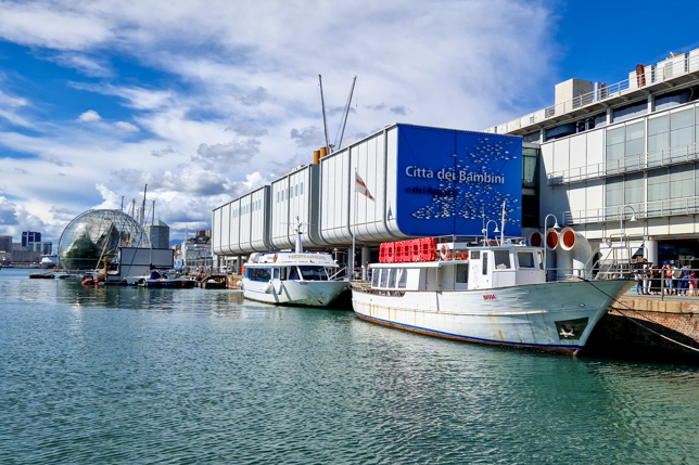 In anderen Städten steht an so prominenter Stelle ein Riesenrad, mit dem man sich einen Überblick verschaffen kann – in Genua erledigt dies der Panoramaaufzug Bigo. Die Metallkonstruktion, an der der Aufzug hängt, wurde anlässlich der Kolumbusfeiern im Jahr 1992 errichtet und ist den alten hölzernen Ladekränen nachempfunden. Der Aufzug befördert Gäste wie uns bis auf eine Höhe von 40 Metern, dreht sich mehrmals um die eigene Achse und bietet so einen wundervollen Panoramablick über die Altstadt von Genua und die neben dem Hafenbecken am Kreuzfahrtterminal liegenden Kreuzfahrtschiffe.