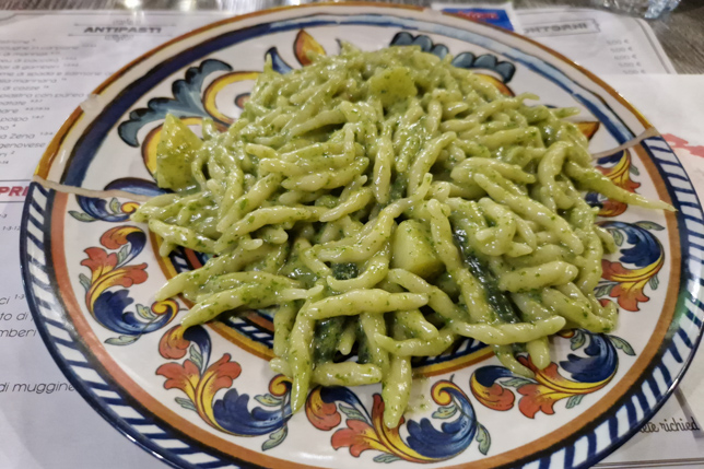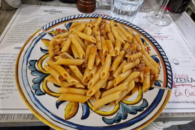 Wieder in unserer Unterkunft angekommen, legten für ein paar Minuten die Füße hoch. Kurz nach 18 Uhr machten uns auf zum Abendessen – in der Annahme, die von uns ausgewählte Trattoria Vegia Zenia sei durchgehend geöffnet. Beim Reinkommen war jedoch lediglich eine Servicekraft vor Ort, die leider kein Englisch sprach oder verstand. Wir sollten uns an einen Tisch in dem noch komplett leeren Restaurant setzen und – wie wir verstanden – 10 Minuten warten. Kurze Zeit später kamen weitere Mitarbeiter herein, die sich sichtlich wunderten, dass bereits Gäste anwesend waren. Eine Englisch sprechende Servicekraft informierte uns dann, dass die Küche erst in 25 Minuten – um 19 Uhr- öffnete.