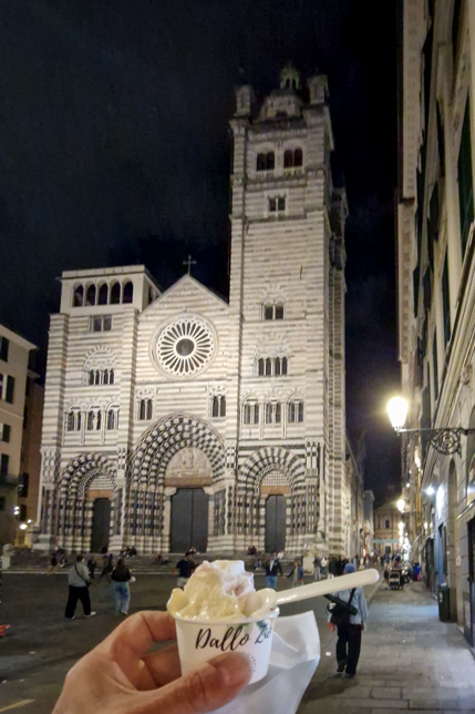 Der nächtlich angestrahlte Dom lag auf einem kleinen Umweg, den wir zu unserer Unterkunft nahmen – und gar nicht so überraschend fanden wir auch eine geöffnete Eisdiele für ein letztes Gelato in Genua.