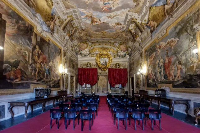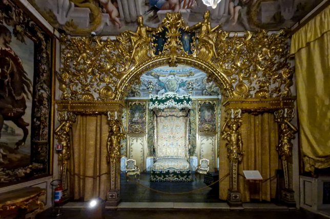 Das Prunkstück des Palastes ist sicherlich der Alkoven, den Carlo Mansi anlässlich seiner Hochzeit mit Eleonora Pepoli entwerfen ließ. Vier aus Holz geschnitzte und vergoldete weibliche Figuren führen in den Raum, in dessen Mitte der Baldachin steht – umgeben von Vögeln aller Art zwischen Blumen, Granatäpfeln und Trauben. Genutzt wurde der Raum nur zu besonderen Anlässen oder für hohe Gäste wie Prinzen, Herzöge und Könige, die in diesem Bett schlafen durften.