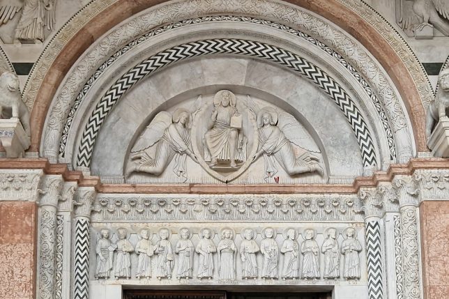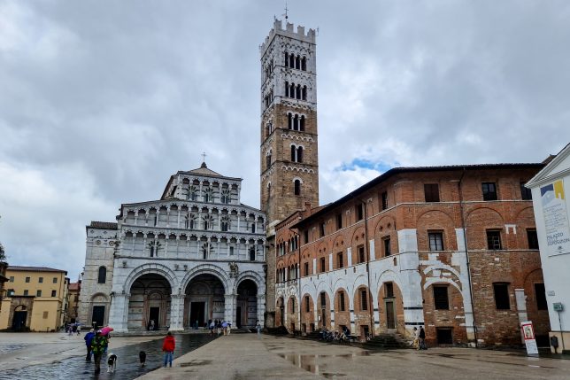 Vor dem weiteren Spaziergang zur Kathedrale San Martino hatten wir uns eine kleine Espresso-Pause redlich verdient. Der Regen hörte langsam auf, und blauer Himmel blitzte bereits durch die dichte Wolkendecke. Angekommen auf dem Platz vor der Kathedrale schauten wir uns zuerst die prachtvolle Fassade an. Wer genau hinschaut, sieht, dass die Fassade der Kathedrale nicht ganz symmetrisch errichtet wurde. Sind es nach links acht Säulen, die die Fassade schmücken, finden sich auf der rechten Seite lediglich sechs.