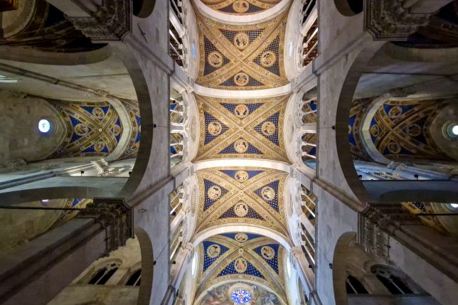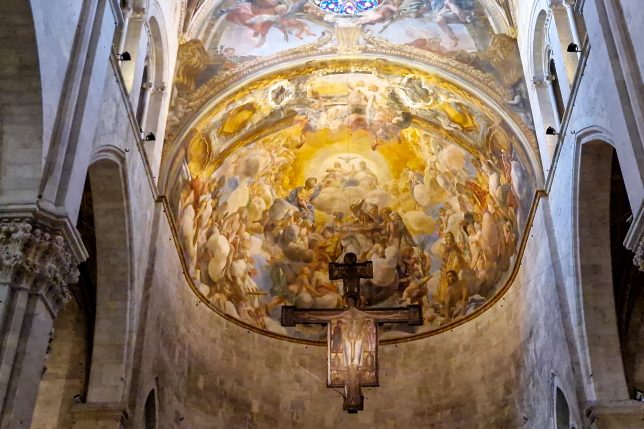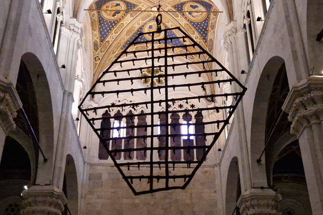 Im Innern fällt auf der linken Seite der ungewöhnliche, aktuell eingerüstete kleine Tempel auf. Hier wurde vor Beginn der Restaurierung das antike Bild des Volto Santo aufbewahrt – eine monumentale Holzskulptur des lebenden Christus am Kreuz, das jahrhundertelang gläubige Pilger in die Stadt zog.