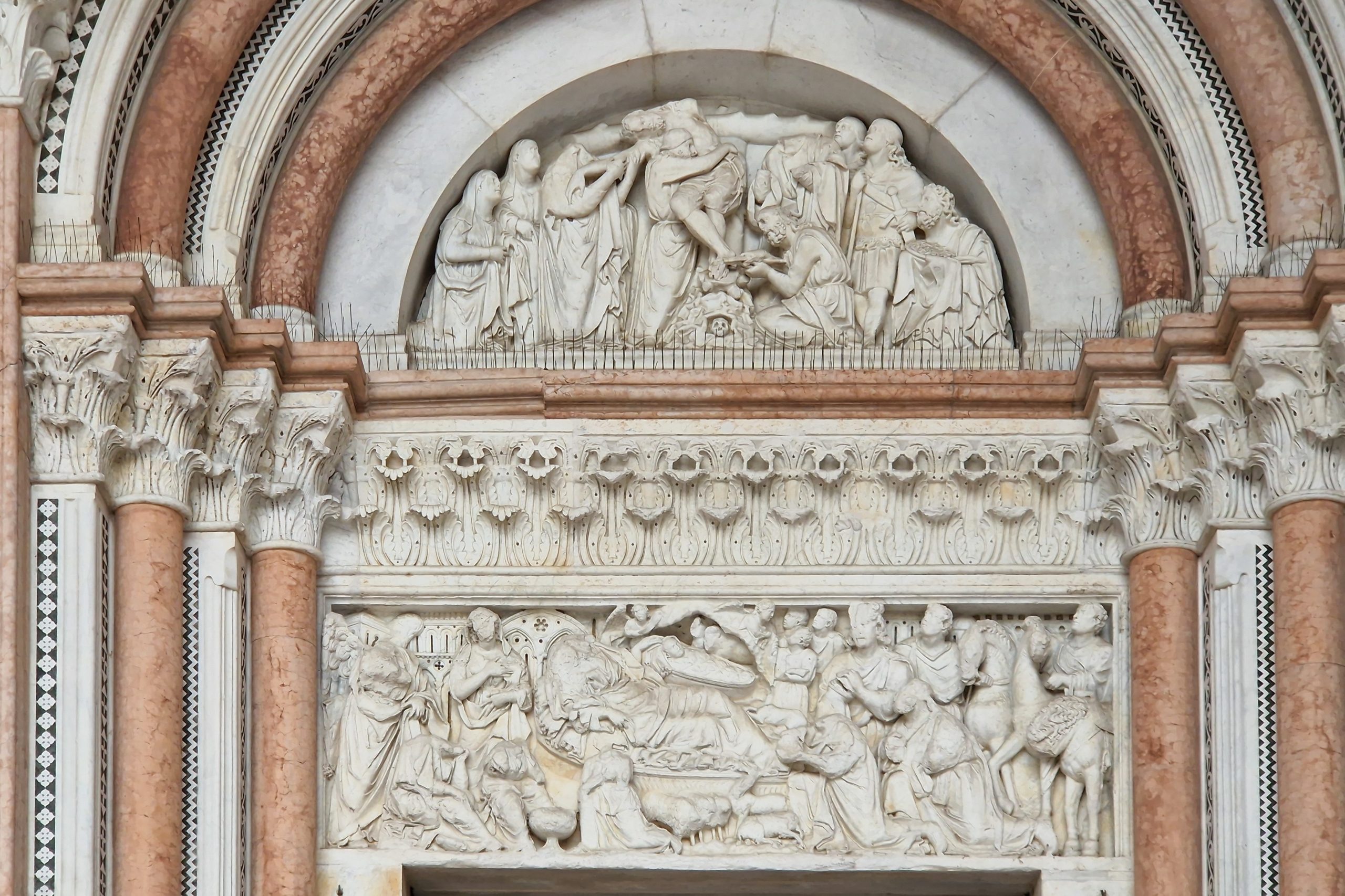 Die drei Portale der Kathedrale sind reich mit Figuren geschmückt. Über dem Hauptportal ist die Himmelfahrt Christi in Anwesenheit der Jungfrau und der Apostel dargestellt, über dem linken Portal oben die Kreuzabnahme und darunter die Geburt Christi und die Anbetung der Heiligen Drei Könige.