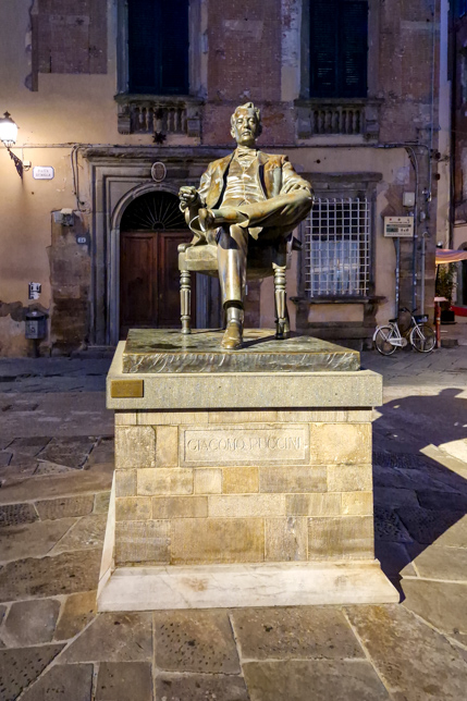 Nach dem Essen bummelten wir ein wenig durch die nächtlichen Straßen von Lucca: Wir kamen am Denkmal des in Lucca geborenen Opernkomponisten Giacomo Puccini vorbei und warfen einen Blick auf die Auslagen der mittlerweile geschlossenen Geschäfte.