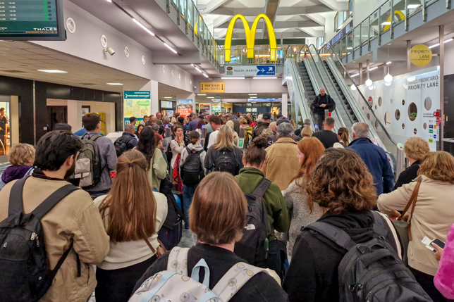 Am nächsten Morgen machten wir uns früh auf den Weg zum Flughafen nach Pisa, um unseren Mietwagen, der uns in den letzten 14 Tagen treue Dienste geleistet hatte, zurückzugeben und anschließend den Flug zurück nach Deutschland in Angriff zu nehmen. Es dauerte ungewöhnlich lange bei der Rückgabe des Wagens, und als wir den Terminal des Flughafens betraten, waren die Menschenmassen zunächst einmal ein kleiner Schock. Zum Glück wartete bei der Kofferabgabe für Lufthansa niemand in der Schlange, sodass dies schnell erledigt war. Die Schlange beim Sicherheitscheck war zwar sehr lang, aber es ging zügig voran.