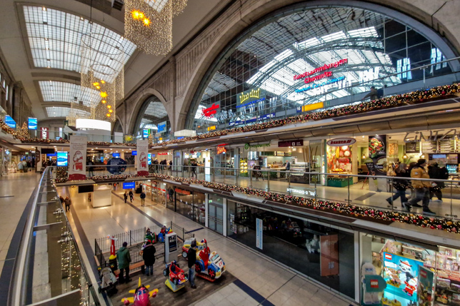 Unser Tag in Leipzig begann am Hauptbahnhof. Mit einer Fassadenlänge von 298 Metern gilt er als einer der größten Kopfbahnhöfe Europas. Gebaut wurde der Bahnhof zwischen 1909 und 1915, die symmetrische Anlage hat einen kuriosen Hintergrund: Da sich damals zwei konkurrierende Bahngesellschaften – die Preußische und die Sächsische Staatsbahn – die Betriebsrechte teilten, verfügt der Bahnhof über zwei separate Eingangshallen und war quasi ein Doppelbahnhof. Nach der Wende wurde das Gebäude aufwendig saniert und beherbergt heute auf drei Etagen rund 140 Geschäfte – eine gelungene Verbindung von historischer Architektur und modernem Shopping.