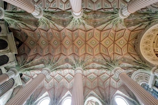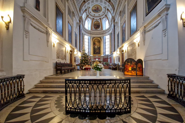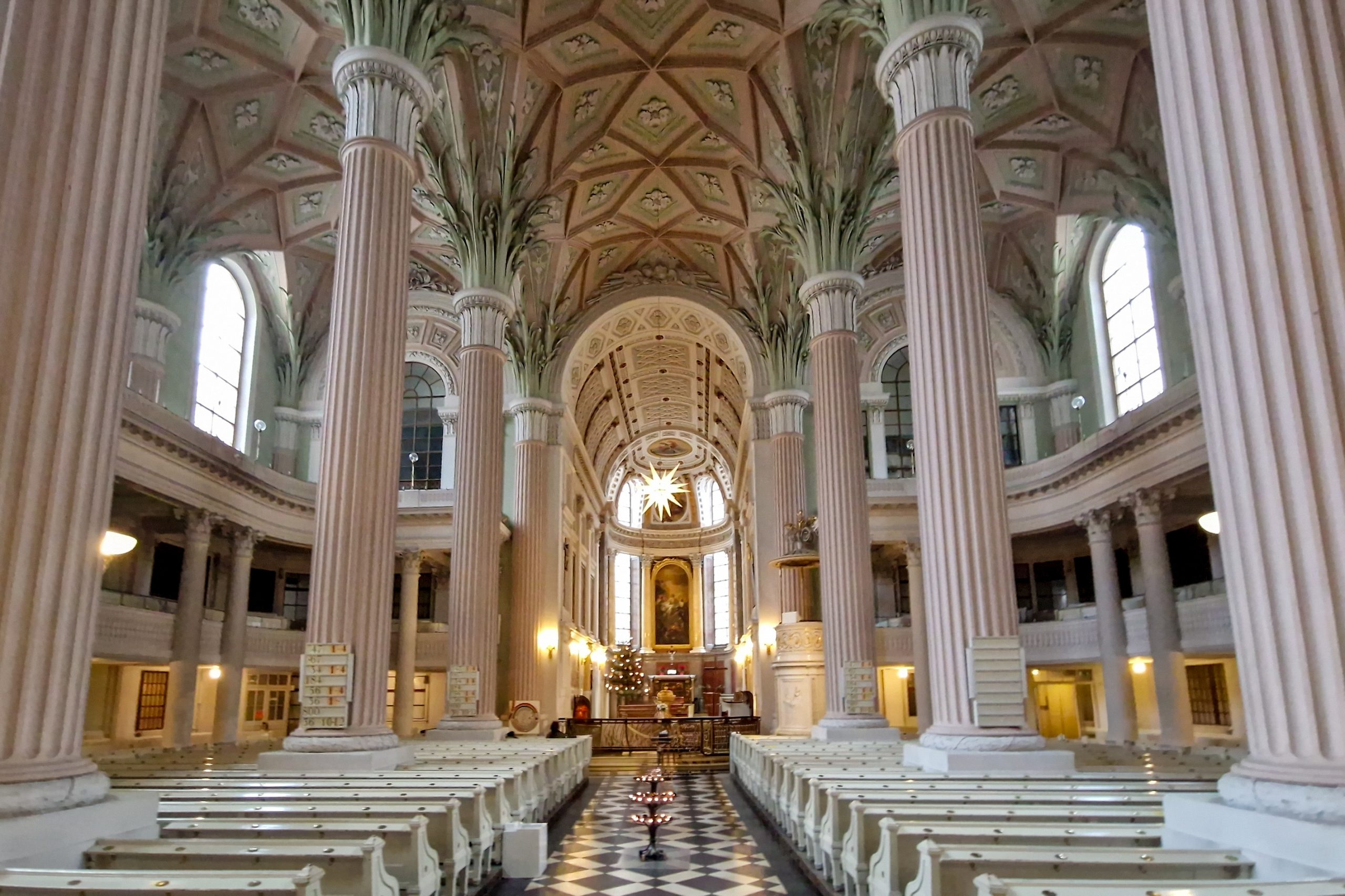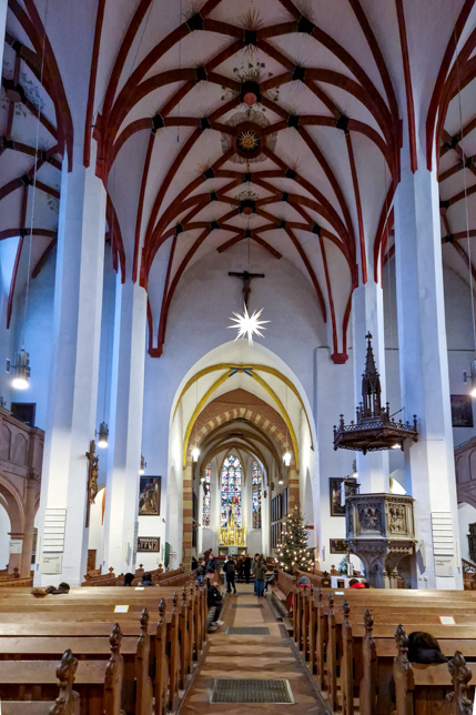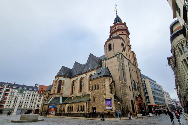 Die älteste und größte Kirche Leipzigs wurde bereits im 12. Jahrhundert gegründet, ihr heutiges Erscheinungsbild mit den markanten zweigeschossigen Emporen und den palmenförmigen Säulen verdankt sie jedoch einem klassizistischen Umbau Ende des 18. Jahrhunderts. Das Innere der Kirche ist in hellen, pastellfarbenen Tönen gehalten – eine ungewöhnliche Atmosphäre.