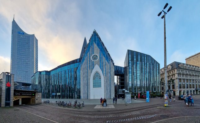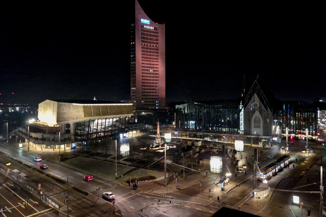 Unser nächstes Ziel war der Augustusplatz, einer der größten innerstädtischen Plätze Deutschlands mit einer Fläche von etwa 40.000 Quadratmetern. Die DDR-Stadtplanung hinterließ hier ihre Spuren: Nach den Zerstörungen im Zweiten Weltkrieg wurde der Platz in den 1960er-Jahren neu gestaltet, wobei historische Gebäude modernen Bauten weichen mussten. Heute dominieren das Gewandhaus, die Oper und Leipzigs einziger Wolkenkratzer, das City-Hochhaus, das Bild.