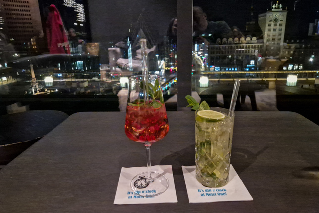 Nach diesem kulinarischen Ausklang bummelten wir noch ein wenig durch die abendliche Innenstadt zurück zum Augustusplatz. Auf der gegenüberliegenden Straßenseite bietet das Motel One Leipzig Post in der obersten Etage seine öffentlich zugängliche Rooftop One Bar, in der man in toller Atmosphäre einen Drink genießen und auf das Treiben unten auf dem Augustusplatz schauen kann – eine Versuchung, der wir nicht widerstehen konnten.