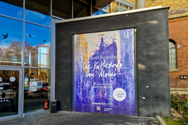 Seine Darstellung eines Tages im Jahr 129 n.Chr. im antiken Pergamon hatten wir im gleichnamigen Museum in Berlin an Ostern 2025 gesehen. Heute zeigte eine Ausstellung rund um die Innenwand des Panometers die Entstehungsgeschichte des Rundbilds “Kathedrale von Monet” sowie weitere Arbeiten von Yadegar Asisi.