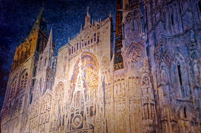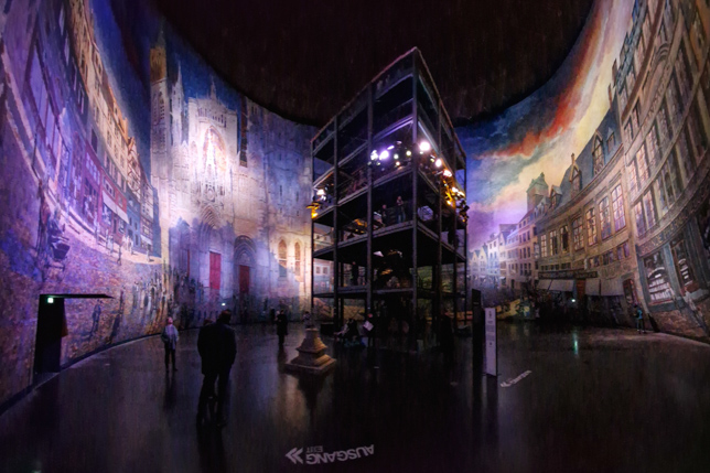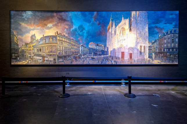 Im Innern erstreckte sich auf einer Höhe von 32 Metern und einer Länge von 111 Metern Asisis Interpretation von Claude Monets Kathedrale von Rouen. Das Panorama zeigt nicht nur die gotische Fassade der Kathedrale in verschiedenen Lichtstimmungen, sondern auch das Leben im und um das mittelalterliche Bauwerk herum. Die Detailverliebtheit ist faszinierend: Menschen in historischen Gewändern, Händler auf dem Marktplatz, das Spiel von Licht und Schatten auf dem Mauerwerk. Durch eine ausgeklügelte Beleuchtung verändert sich die Szenerie im Laufe des Tages, von der Morgendämmerung bis zur Abenddämmerung.