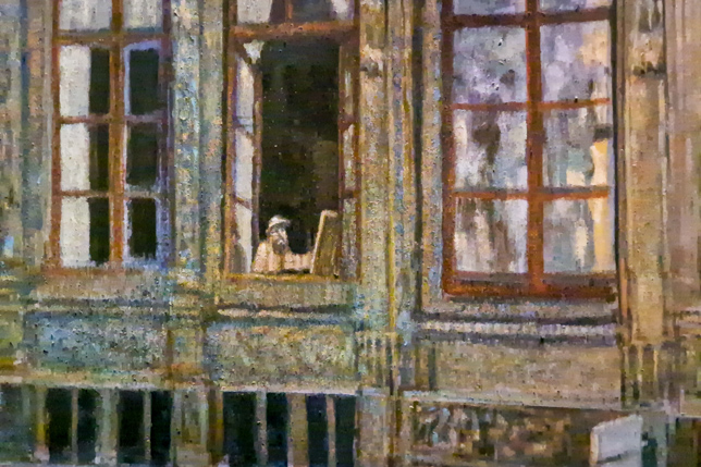 Wer genau hinschaut, entdeckt auf dem Gemälde Claude Monet selbst an einem Fenster vor der Staffelei in seiner Wohnung gegenüber der Kathedrale.