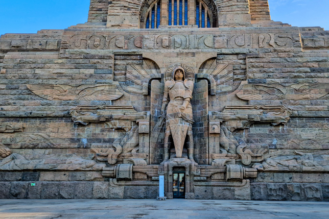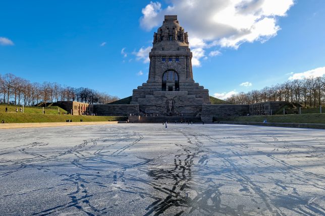 Vom Panometer aus machten wir uns auf den Weg zum Völkerschlachtdenkmal – bei strahlendem Sonnenschein, aber eisigen Temperaturen. Das Denkmal, im Südosten Leipzigs gelegen, ist mit 91 Metern Höhe eines der größten Denkmäler Europas. Eingeweiht wurde es 1913 zum 100. Jahrestag der Völkerschlacht bei Leipzig, in der im Oktober 1813 die Truppen Napoleons von den verbündeten Armeen Russlands, Preußens, Österreichs und Schwedens besiegt wurden. Allein die Dimensionen der Anlage sind beeindruckend.