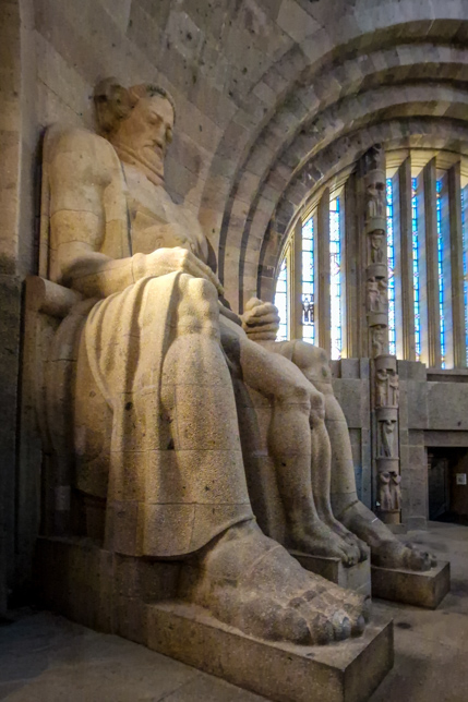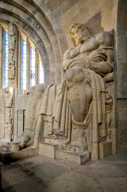 In der Ruhmeshalle eine Etage tiefer stehen vier monumentale, ca. 10 Meter hohe Figuren, die als Sinnbilder für die deutschen Tugenden Glaubensstärke, Tapferkeit, Volkskraft und Opferbereitschaft gelten.