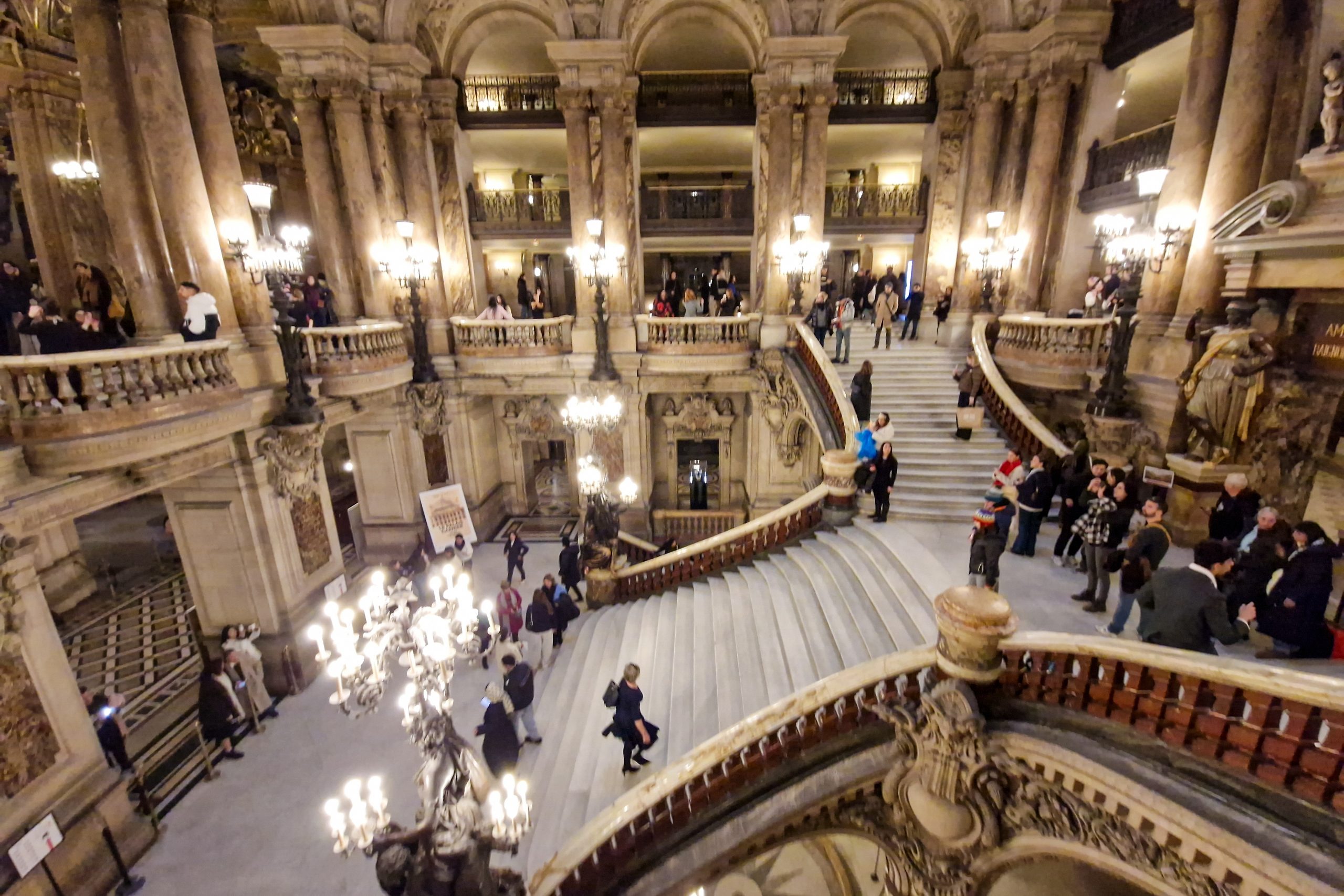 Weiter ging es zum nächsten Ziel, der Opéra Garnier, nur wenige Gehminuten entfernt. Das prächtige Opernhaus, entworfen von Charles Garnier und 1875 eingeweiht, ist ein Meisterwerk des Neobarock und eines der Wahrzeichen von Paris. Wir wollten uns keine Vorstellung anschauen, sondern einfach nur das Gebäude besichtigen – das allein ist schon überwältigend. Die große Treppe aus weißem Marmor, die vergoldeten Verzierungen, die Deckengemälde, die opulenten Kronleuchter – der Besucher wähnt sich eher in einem Schloss als in einem Opernhaus.