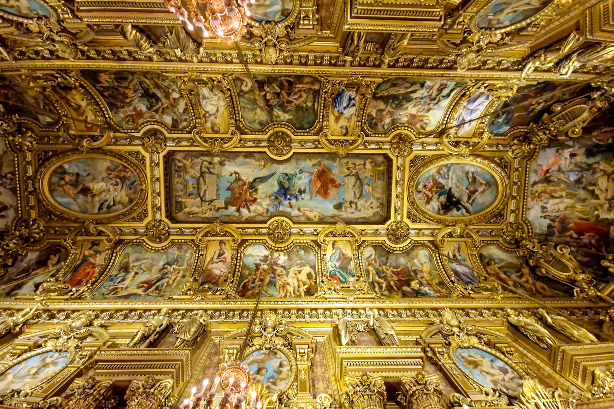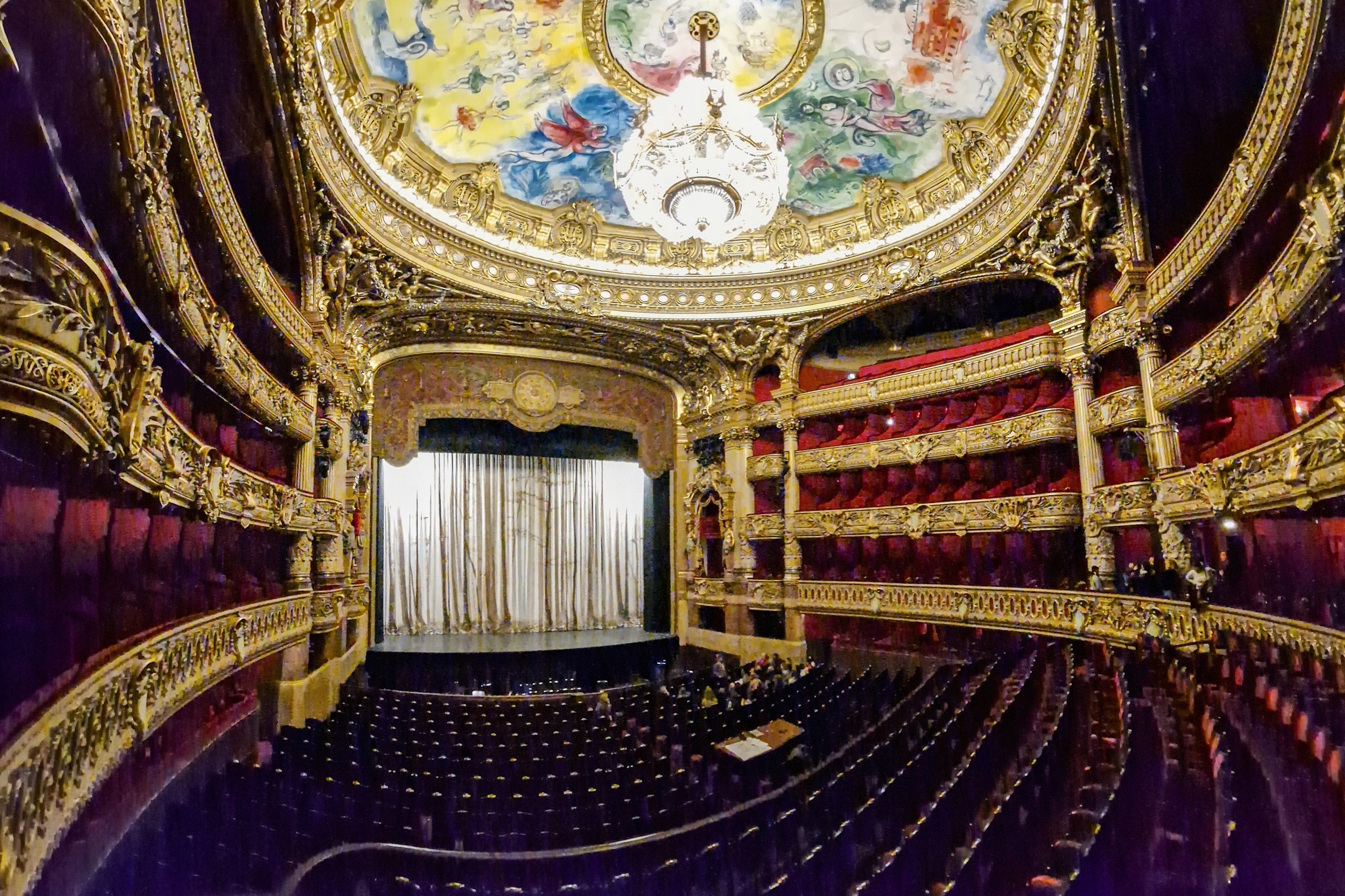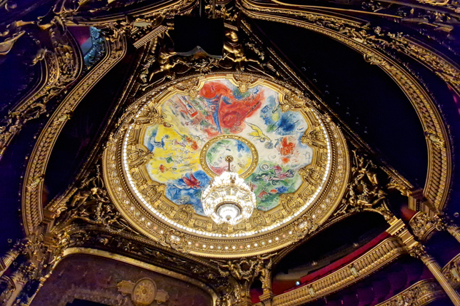 Garnier kam er zu dem Schluss, dass für den Veranstaltungssaal, dem Herz des Theaters, eine Hufeisenform die beste wäre, um die konkurrierenden Anforderungen an Akustik und Sehvermögen in Einklang zu bringen. Die Bühne war zur Zeit ihrer Errichtung die größte der Welt: 49m breit, 26m tief und 72m hoch. Das ursprüngliche Deckengemälde, 1872 von Eugène Lenepveu gemalt, stellte “Le Triomphe de la Beauté” (Der Triumph der Schönheit) dar. Im Jahr 1960 wurde es auf Wunsch von Kulturminister André Malraux von Marc Chagall übermalt.