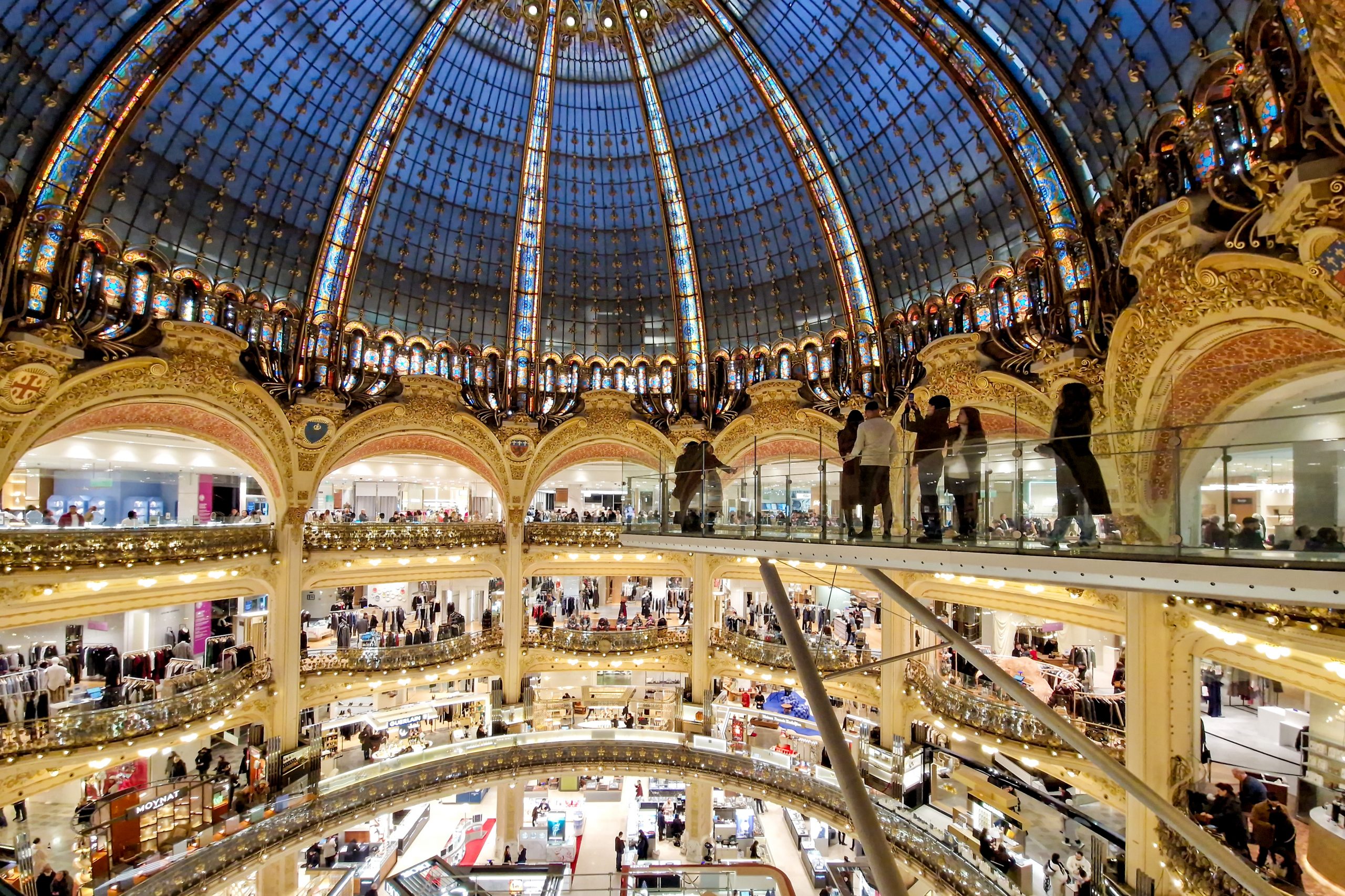 Wir trösteten uns mit dem sogenannten “Glasswalk” unter der Kuppel, einem gläsernen Laufsteg, der weit in den Raum unter der riesigen Glaskuppel ragt. Nach kurzem Anstehen – auch hier war der Andrang groß – durften wir für fünf Minuten den Steg betreten, um den Rundumblick auf die Etagen des Kaufhauses zu genießen. Unter uns erstreckten sich Luxusmarken wie Chanel, Dior, Louis Vuitton oder Hermès – die gesamte Crème de la Crème der Modewelt.