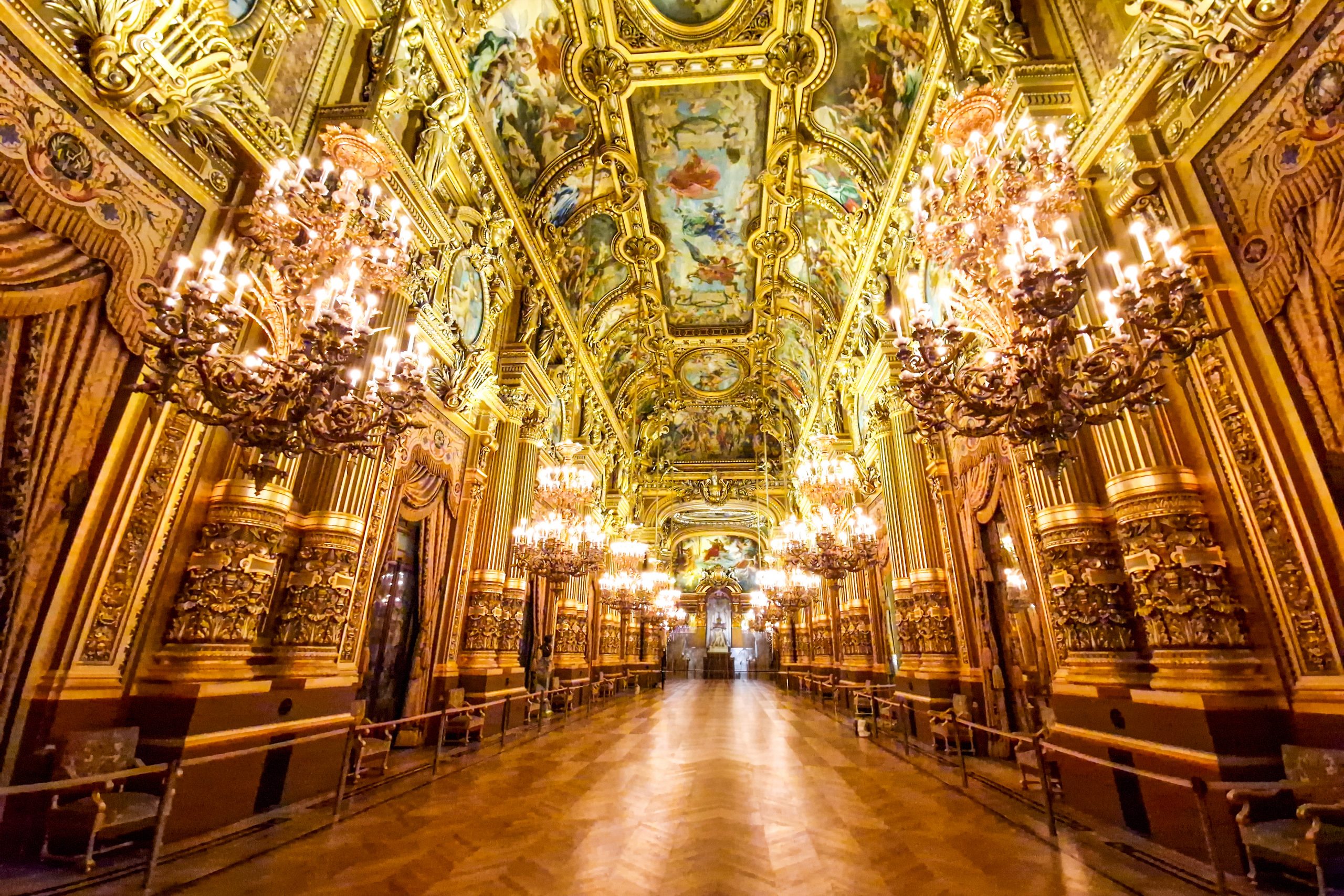 Im Grand Foyer weiß das Auge gar nicht, wo es vor lauter Prunk, goldenem Glanz und Kerzenleuchtern hinschauen soll. Auf dem Foto sind übrigens deshalb keine Menschen zu sehen, weil es kurz vor Schließung der Oper geschossen wurde und die Bildbearbeitung dabei half, die restlichen noch verbliebenen Besucher zu entfernen.