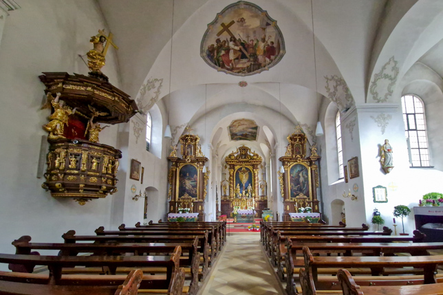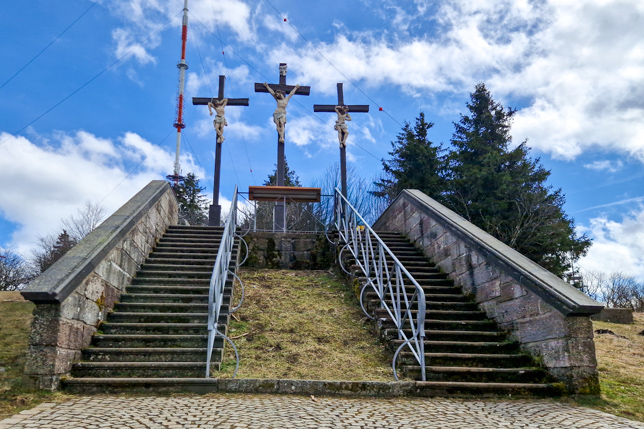 Heute befindet sich auf dem Gipfel eine Kreuzigungsgruppe mit lebensgroßen Figuren. Am Fuß des Hügels steht die Wallfahrtskirche zum Heiligen Kreuz, die zwischen 1682 und 1692 erbaut wurde. Für einen Ostersonntag herrschte in ihr eine andächtige Stille, nur wenige Besucher hatten sich hierher verirrt, zum Gottesdienst waren sicher mehr Besucher hier.