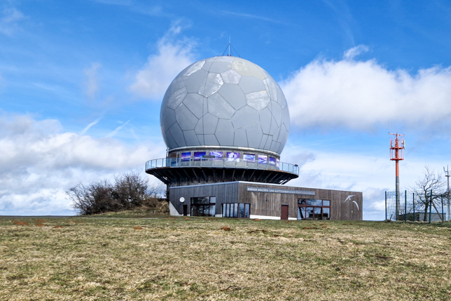 Heute war jedoch nicht an Segelflug zu denken. Der in der offenen Landschaft exponierte Berg empfing uns mit starkem Wind, die Wasserkuppe ist nicht umsonst einer der windreichsten Orte in Deutschland. Vom Parkplatz aus führte ein gut ausgebauter Weg zum Gipfel, wo die markant weiße Radarkuppel RADOM an die Zeit des Kalten Krieges erinnert. Die Rhön war seinerzeit Zonenrandgebiet.