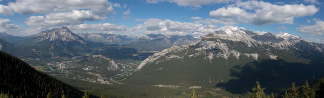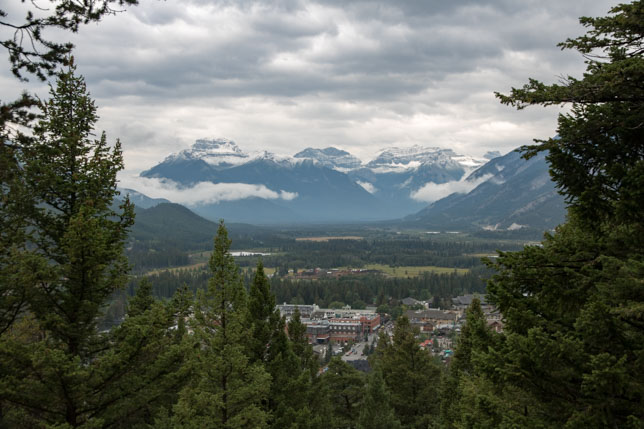 Nach dem Tunnel Mountain Drive fuhren wir zur Talstation der Banff Gondola, um zu schauen, ob sich hier ein schöner Ausblick auf die Stadt ergibt – leider standen zu viele Bäume im Weg. Eine Fahrt auf den Gipfel des Sulphur Mountain mit der Kabinenbahn kostete 64 CAD (Preisangaben immer ohne Steuer). Da die Berggipfel teilweise noch wolkenverhangen waren, entschlossen wir uns zunächst einmal einen kleinen Spaziergang zu machen und danach zu entscheiden, ob wir die Banff Gondola nutzen oder uns das Geld sparen können.