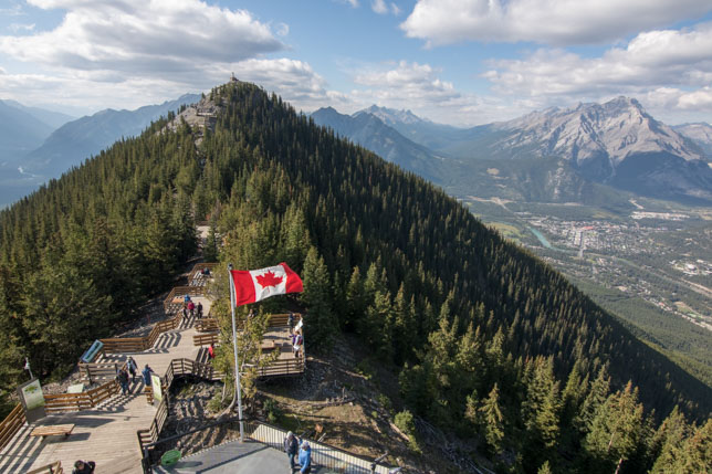 Da sich die Wolken rund um die Bergspitzen mittlerweile verzogen hatten, beschlossen wir, mit der Banff Gondola zum Gipfel des Sulphur Mountains hinauf zu fahren. Nach acht Minuten Fahrt standen wir an der Bergstation mit Restaurant und 360 Grad Rundumblick.