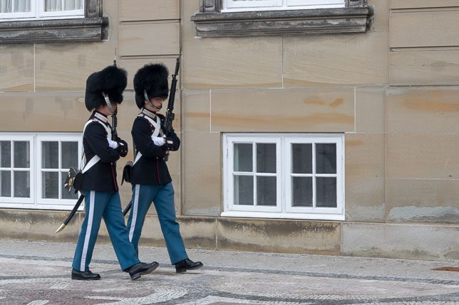 Zum Glück war der nächste Fotostopp an Schloss Amalienborg komplett kostenlos. Um 12 Uhr findet jeden Tag die Wachablösung statt – wenn es eine Rangliste für unliebsame Jobs gibt, gehört der des Wachmanns vor Schloss Amalienborg sicherlich dazu. In der Gegend rumstehen, von Touristen begafft und fotografiert zu werden und dabei noch eine Bärenfellmütze auf dem Kopf tragen zu müssen – das kann nicht wirklich Spaß machen.
