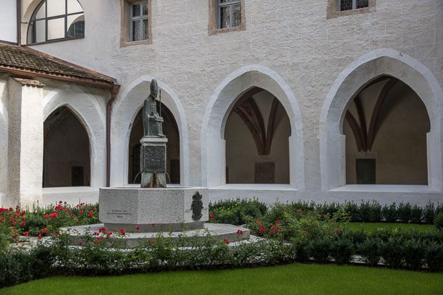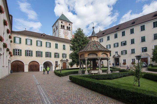 In einem Vorort von Brixen befindet sich das Kloster Neustift, das bereits im Jahr 1142 gegründet wurde und eine wechselvolle Geschichte hinter sich hat. Heute leben in dem Augustinerkloster rund 20 Chorherren, die ihren Dienst als Priester in den umliegenden Kirchengemeinden verrichten. Gut 80% der Südtiroler sind römisch-katholischen Glaubens und so verwundert es nicht, dass die Kirche hier von jeher einen starken Einfluss hatte. Die (mit unserer BrixenCard kostenlose) Führung durch das Kloster startete um 11 Uhr, vorher hatten wir noch die Gelegenheit, einen Blick in den mit Fresken ausgemalten Kreuzgang zu werfen.