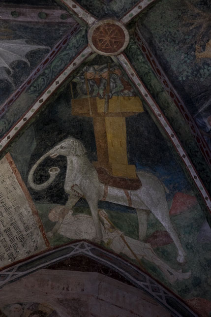 Im Kreuzgang findet sich eine kleine Rarität. Der Maler, der eine biblische Szene mit Elefant darstellen sollte, hatte dummerweise noch keines dieser Tiere zu Gesicht bekommen, wusste jedoch, dass sie große Ohren und einen langen Rüssel besitzen und einen Turm mit Streitkräften tragen können. Das Bild beinhaltet alle diese Eigenschaften – wie ein Elefant sieht das Tier aber trotzdem nicht aus.