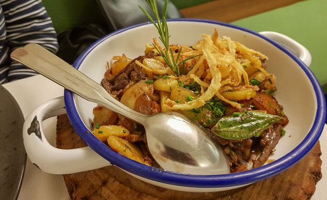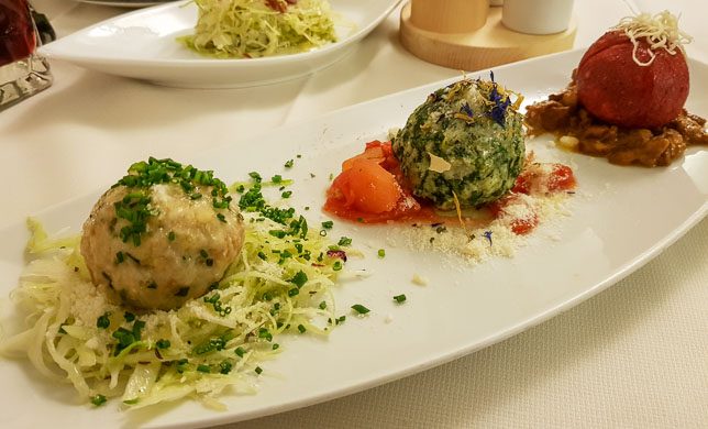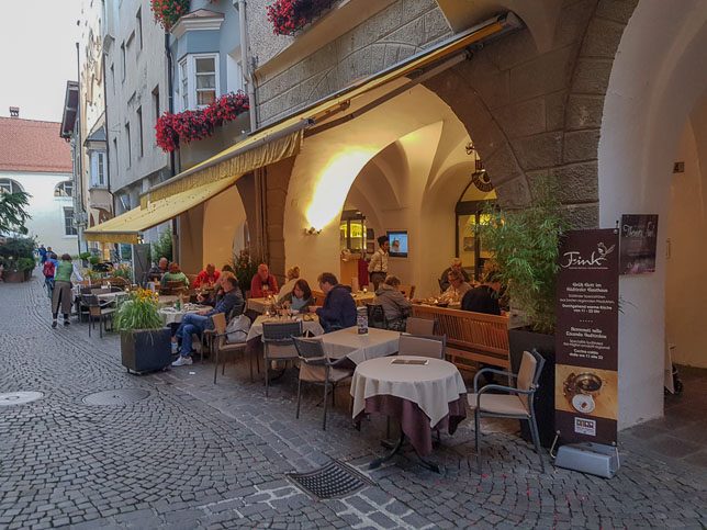 Nach einem kurzen Abstecher durch die Laubengänge der Stadt, bei denen man auch bei schlechtem Wetter trockenen Fußes einkaufen kann, war es Zeit für das Abendessen. Heute fiel unsere Wahl auf das Restaurant Fink und damit erneut auf einheimische Küche: Fink’s Südtiroler Knödeltris sowie Fink’s Tiroler Gröstl vom Rindstafelspitz überzeugten uns erneut von der Südtiroler Küche.